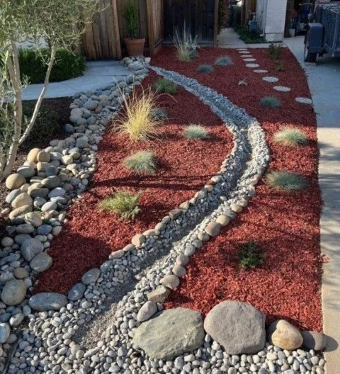 This garden combines purchased red mulch and stones to create a spare native plant garden. (https://www.fws.gov/story/californian-yard-help-pollinators)